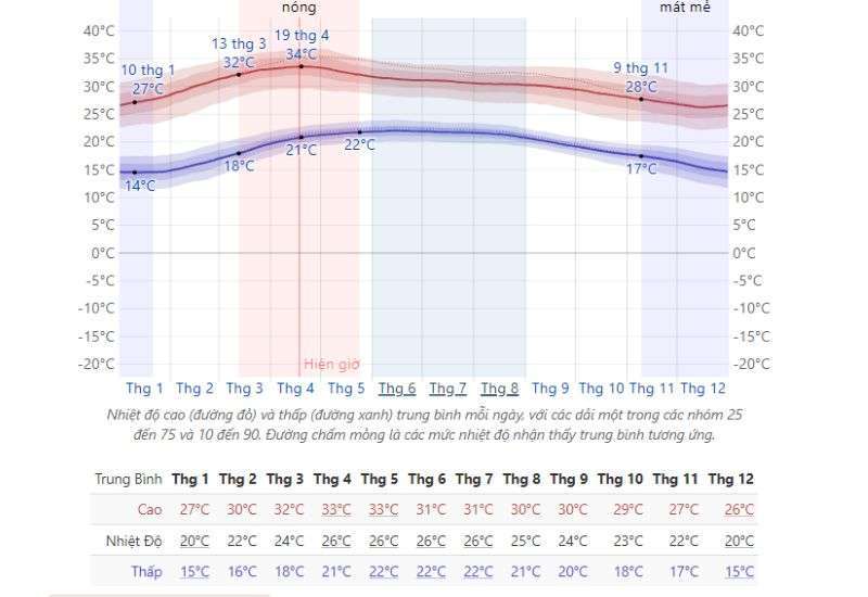 Thời tiết nóng đỉnh điểm thường vào khoảng tháng 3 đến hết tháng 5, nhiệt độ cao trung bình ngày trên 32 độ C. Tháng 5 nóng nhất trong năm, dao động từ 22 đến 33 độ C.